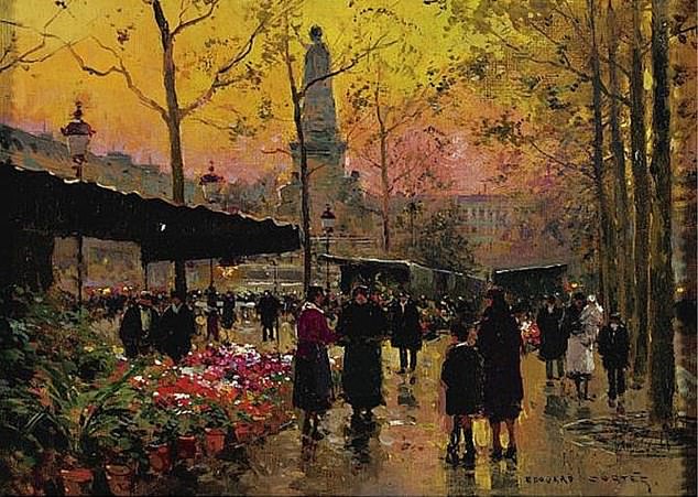 The art piece named Marché aux Fleurs portrayed a lively Parisian street scene.
